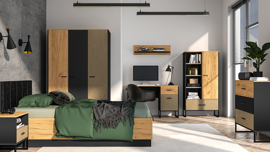 Colt to zarówno bardzo nowoczesna, nieco surowa, jak i doskonale wpisująca się w coraz modniejszy styl loftowy propozycja systemu mebli dla nastolatków od polskiego producenta Ml Meble. Kolekcja została dokładnie przemyślana i stworzona z myślą o jak najlepszej funkcjonalności, zachowując przy tym odpowiednią estetykę, pasującą do gustów młodych ludzi. Niebanalny design, a także łatwa w użytkowaniu konstrukcja brył to pewność, że wybrane pomieszczenie stanie się przyjazną, przytulną oazą, w której będzie można się uczyć, rozwijać swoje pasje, spotykać z przyjaciółmi, spać, a także relaksować po intensywnym dniu. Meble posiadają czarne korpusy oraz metalową podstawę, co ładnie kontrastuje z frontami w kolorze stali premium oraz nawiązującym do naturalnego drewna odcienia dębu craft złotego. Kolekcja Colt składa się z pojemnych szaf, solidnych komód, wysokich regałów, masywnej szafki nocnej, półki ekspozycyjnej oraz różnych modeli łóżek, dzięki którym każda przestrzeń zyska nowego, wyjątkowego charakteru. Uniwersalna kolorystyka, prostolinijność brył, neutralność konstrukcyjna pozwalają tworzyć konkretne zestawy i dobierać dodatki w bardziej odważnych oraz intensywniejszych barwach.