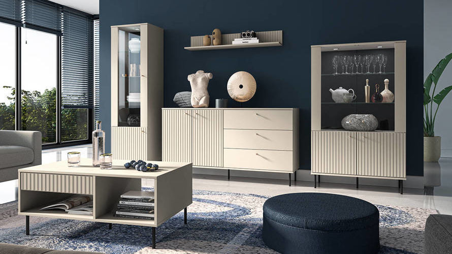 Sophie to kolekcja niezwykle funkcjonalnych mebli, które z powodzeniem sprawdzą się jako elementy wyposażenia salonu urządzonego w duchu nowoczesności. Charakteryzuje się ona oryginalnymi ryflowaniami na frontach, eleganckim wykończeniem, zachwycającym odcieniem kaszmiru, a także klasycznymi konstrukcjami brył nawiązującymi do skandynawskiego minimalizmu. Bez żadnych wątpliwości Sophie można uznać za rewelacyjne odzwierciedlenie najmodniejszych trendów wnętrzarskich, a co za tym idzie odpowiedzieć na coraz bardziej wymagające gusta odbiorców. Stabilne podparcie dla brył stanowią nóżki w neutralnej czerni, które ładnie kontrastują z delikatnym odcieniem kremu, a złote uchwyty pełnią funkcję nie tylko użyteczną, ale również wizualno-estetyczną nadając całości kolekcji wyjątkowego charakteru. Złoty kolor uchwytów wprowadza błyszczący efekt zarówno rozjaśniający, jak powiększający przestrzeń, co ma niebagatelne znaczenie w przypadku pokojów dziennych o mniejszych nieco rozmiarach. To piękna propozycja od polskiej marki Ml Meble, która daje możliwość stworzenia czegoś wyjątkowego we wnętrzu własnego domu.